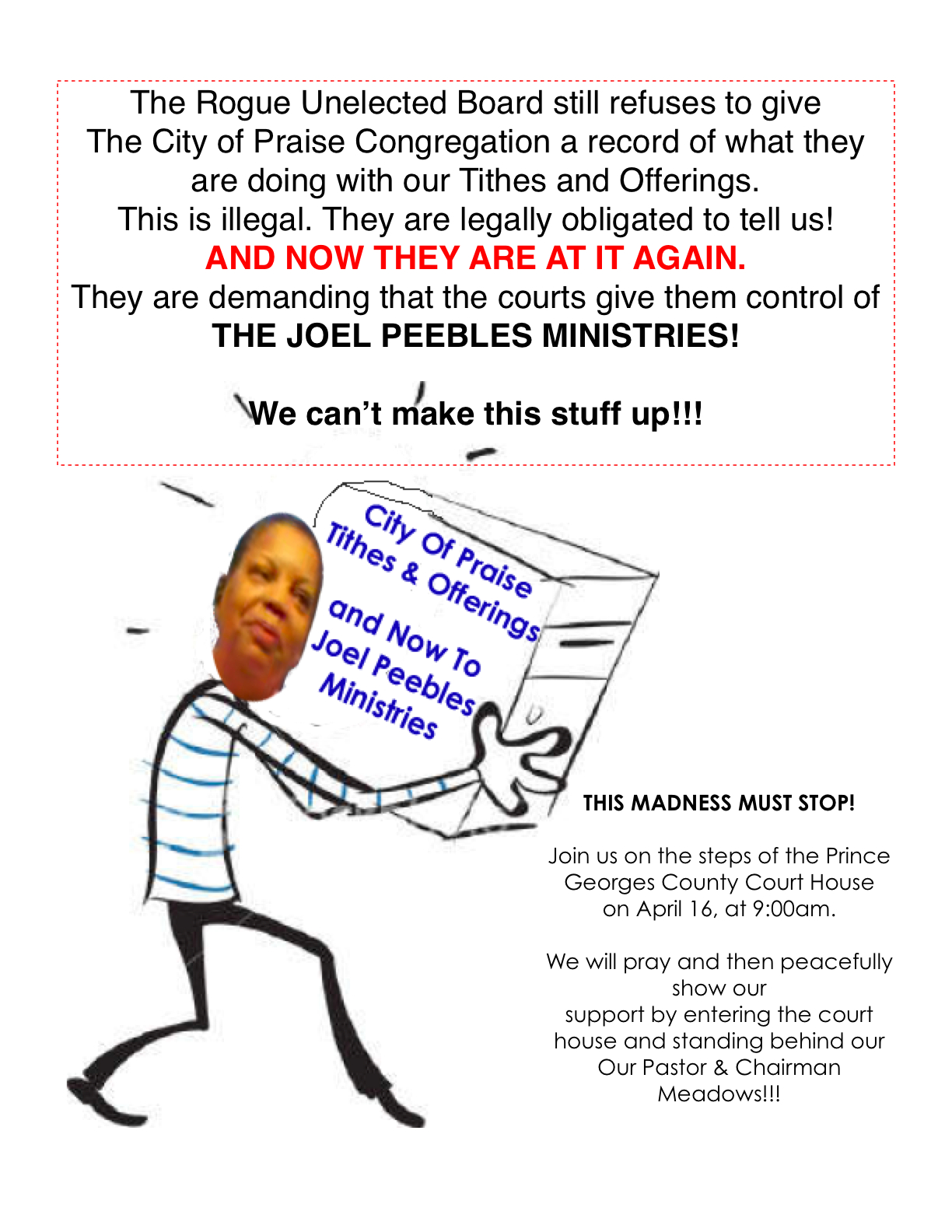 The Greedy Self-Appointed Rogue Board wants your Tithes today and Joel Peebles Ministries Tomorrow!! April 3, 2012 by peopleofpraisemd 0 Share this: Click to share on X (Opens in new window) X Click to share on Facebook (Opens in new window) Facebook Like Loading... Related