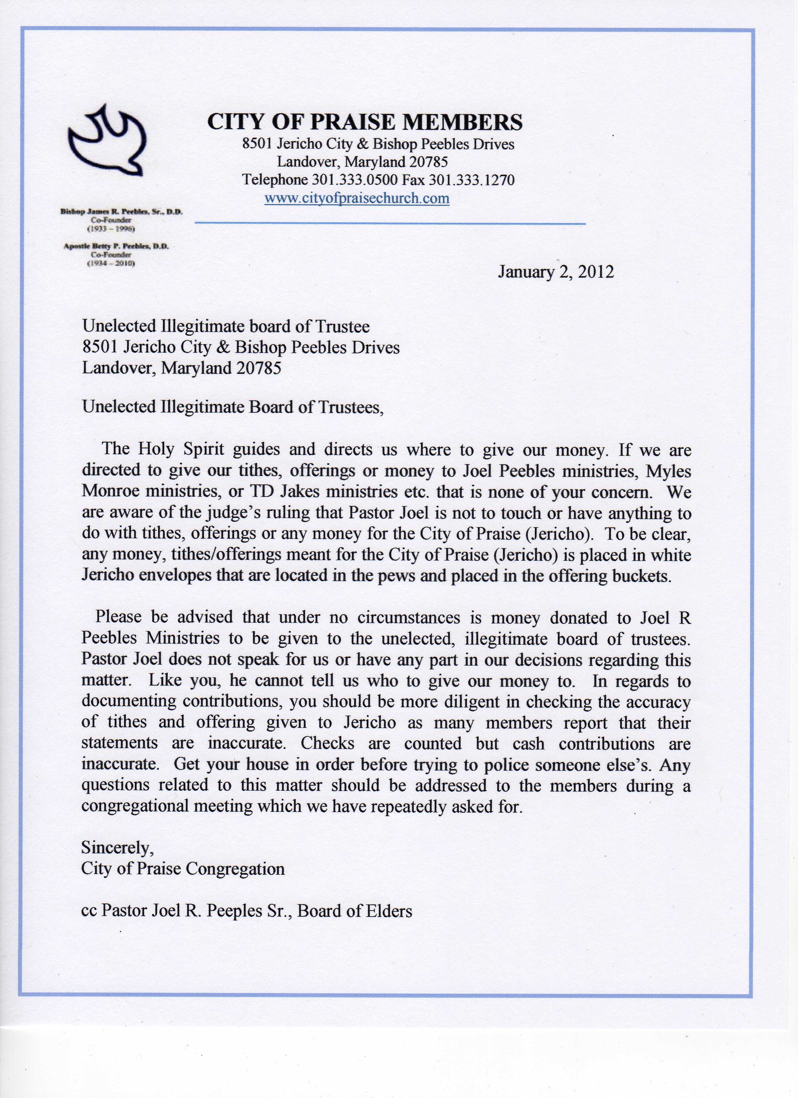 Below is the letter that we, the congregation, sent to the 6 members of the self appointed, unelected board in regards to our tithes and offerings